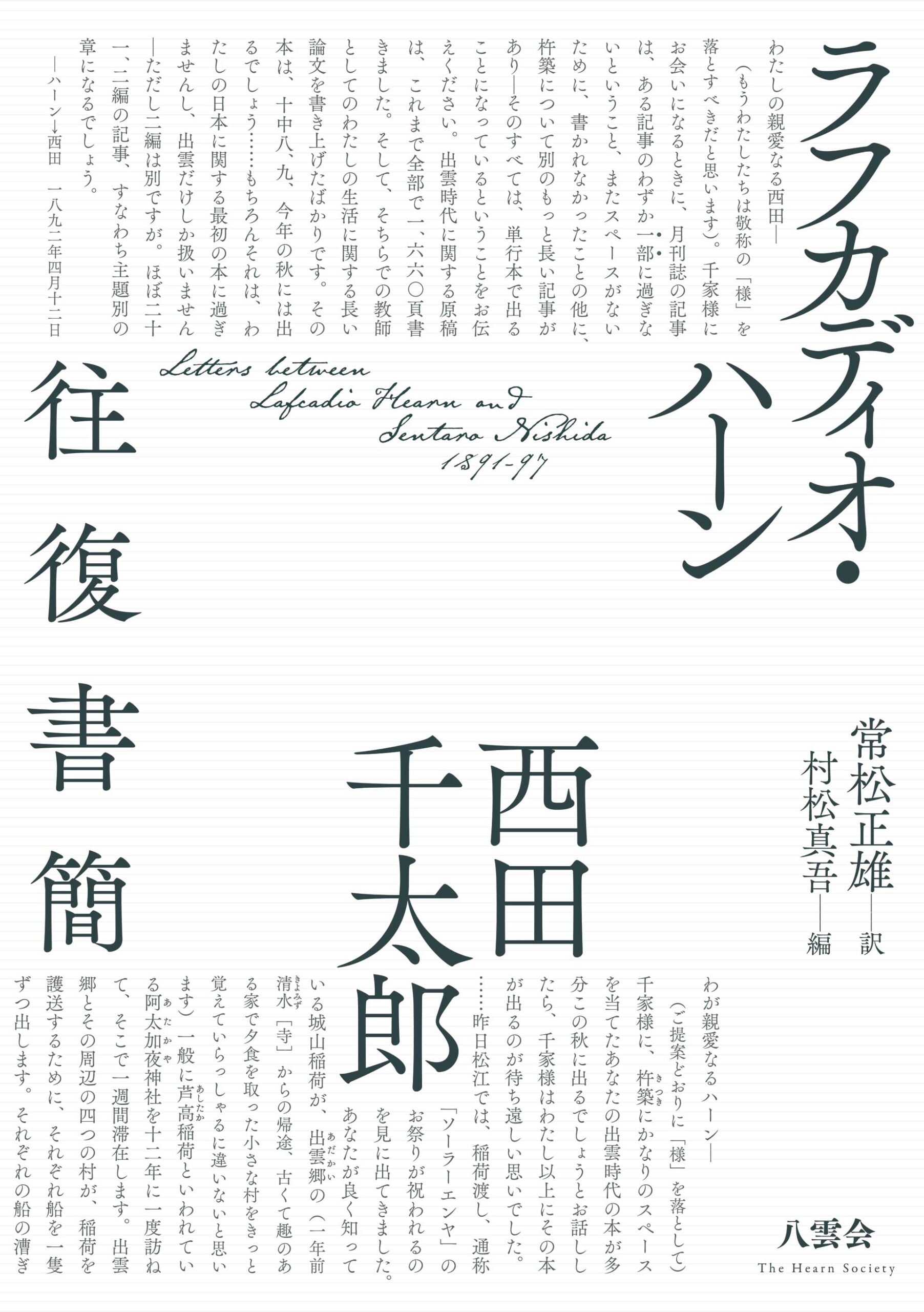 ご好評いただいております八雲会発行の常松正雄(訳)、村松真吾(編)『ラフカディオ・ハーン 西田千太郎 往復書簡』につきまして、八雲会事務局の在庫分は完売いたしました。